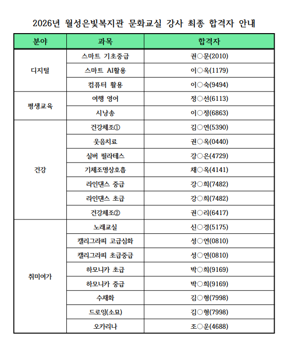 | 2026년 월성은빛복지관 문화교실 강사 최종합격자 안내 |